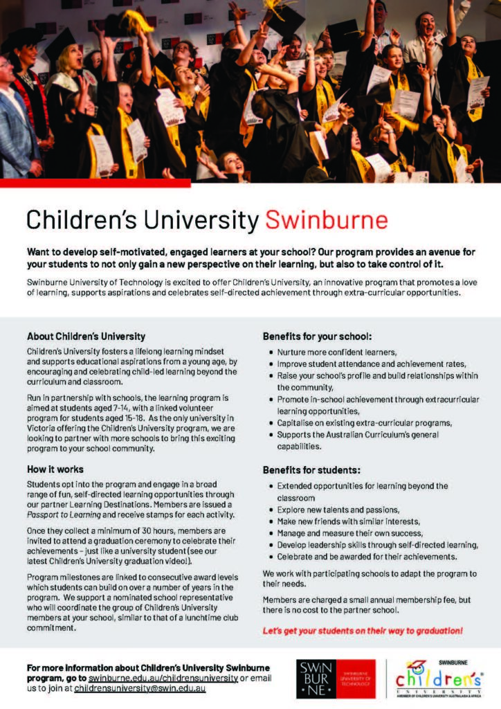 The program strengthens our engagement in the community by connecting students with learning opportunities beyond the classroom and encourages aspiration by exposing them to university environments and future pathways. As students work towards their learning goals and celebrate their achievements at a formal graduation ceremony at Swinburne University, they are recognised for their excellence, effort and commitment to lifelong learning.