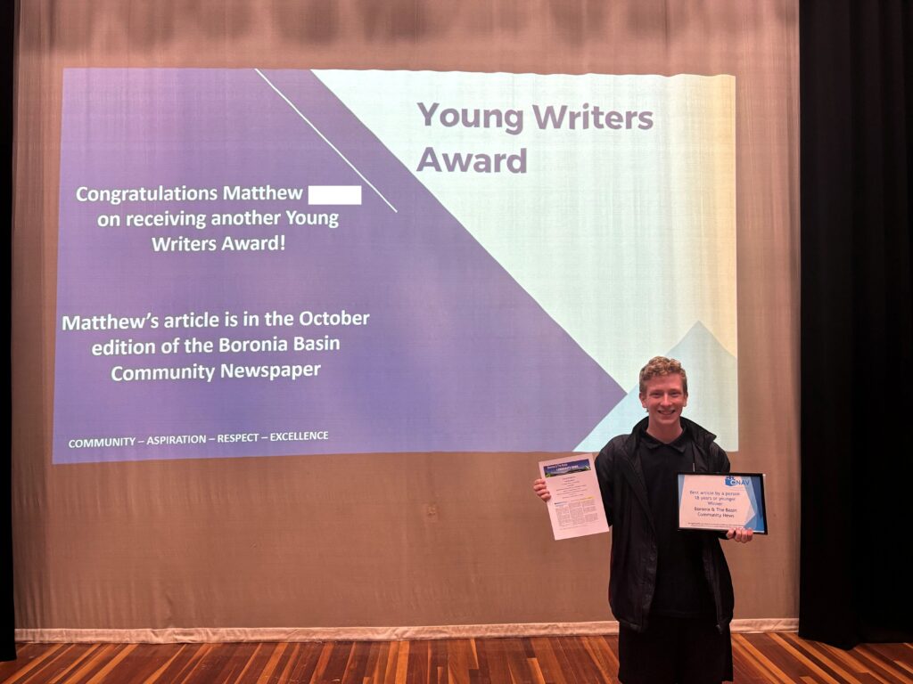 Matthew was awarded the Young Writers Initiative Award for his article published in the October 2025 edition of the Boronia & The Basin Community News. He was also honoured by the Community Newspaper Association of Victoria, winning “Best Article by a Person 18 Years or Younger.”