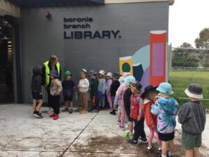 When we arrived at Boronia library, the librarian staff greeted us warmly and showed us to a cosy reading corner. The librarian shared a social story about what a library is, the different spaces to explore, and showed us how to borrow and return books. We gathered for our scavenger hunt. We searched the library for cylinders, opened them up, and discovered pictures of animals inside. Once all animals were found we glued the animals onto a scene where we thought each belonged. We finished our library trip with a relaxing story before making our way back on the long walk.